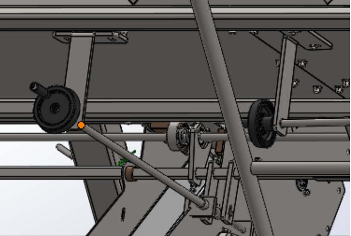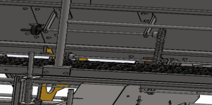 4.播种单元振动板的宽窄通过上面这个旋转把手来调节。旋转把手带着链轮,链轮通过链条带动下面的链轮,下面的链轮通过与螺纹块的距离的改变,来调节播种单元的播种大小,宽窄
