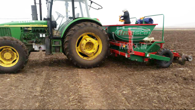 在每一组播种单元中,有一条用在它上面的振动板,这使得微型薯在能够顺利的进入待传送区域。通过传送带引导微型薯,移动向下一个与之转速相同步的压种带,从而播种在土壤中。由于微型薯向下运输,直到他们都非常接近土壤表面,由于微型薯种子被限制在固定的位置,不会产生位移的情况,它们将会被精确的播种在土壤。由平行四边形的开沟器开出一个平等的播种深度,并且配置的限深轮子也会促使微型薯播种精度更加准确。